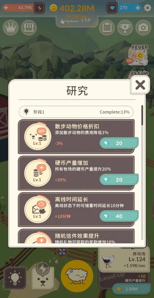 为了优化农场的体验,还有研究所可以进行研究,研究只能通过消耗砖石来进行,比如有“散步价格折扣”、“金币产量增加”、“离线收益延长”等~
