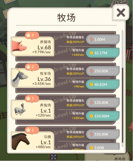 另外通过扩建牧场、升级牧场和强化牧场都可以增加每秒获得的总金币收益。