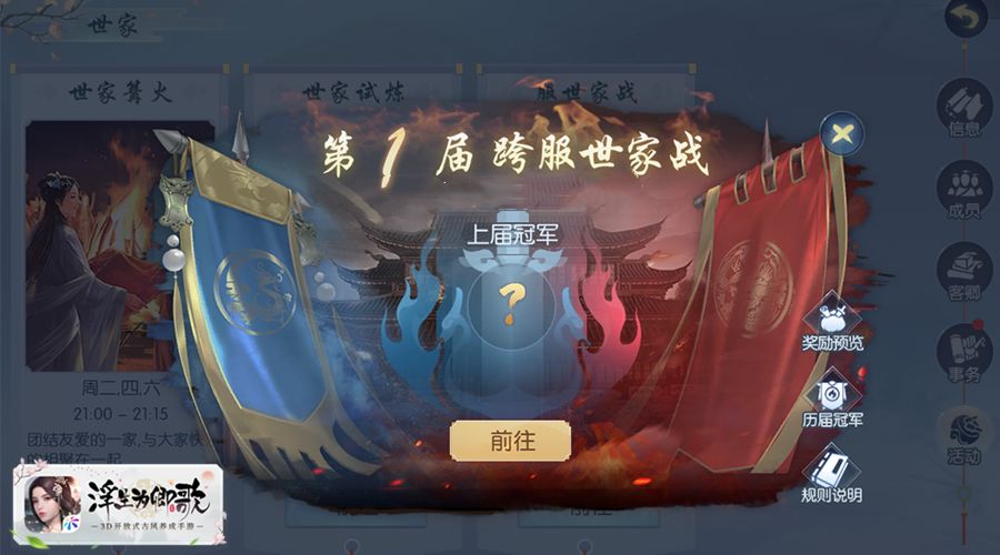 在跨服世家战开启后,世家族长以及副族长即可报名参赛,报名时间为第一周周五12:00至周日21:00,报名成功后,系统将以世家的影响力来进行排名,本服排名前6的世家将获得参赛资格。进入比赛期后,将与战区内其他的世家进行战斗,收获更多独特的游戏乐趣。