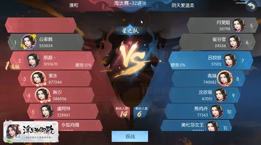 在活动中,每个参赛世家需派出3支小队参赛,3支小队将依次进行对战。战斗将以1V1车轮战形式进行,战败的成员退场,获胜的成员继续与下一位对手交战。在活动中,每场战斗结束后,获胜者会累积一部分疲劳值,疲劳值达到100%时,将不能参与下一场战斗,疲劳值与战斗双方的战力差有关,战力差越小,战斗后积攒的疲劳值越高。待击败敌方小队中所有成员即可获得此小队战的胜利,声名远扬触手可及!