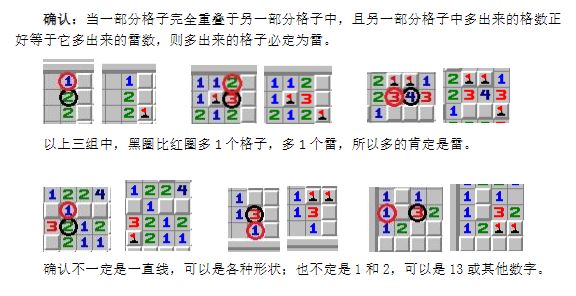 扫雷并不单纯的是靠“乱点”“瞎猜”。也不仅仅是靠“这里有两个雷,所以那个不是雷”这样简单的逻辑推理,而是有一套完整的判雷方法。