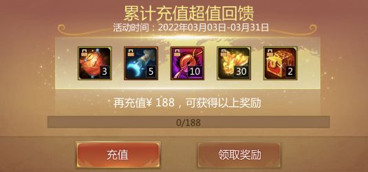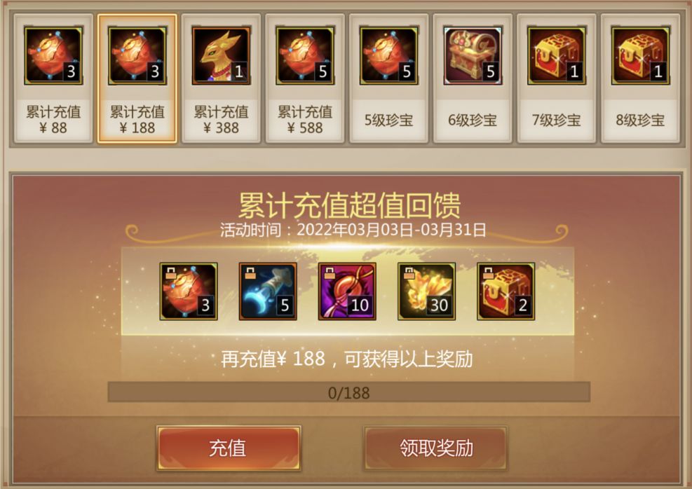 当购买以上两档后,大家的累计充值已经达到了156元,而距离188元珍宝礼包,也只差32元。