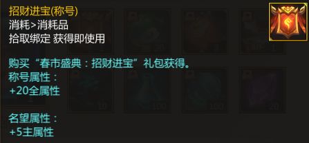 与此同时,还能获得一个换装同名称号—招财进宝,能够为大家带来不错的属性加成哦~
