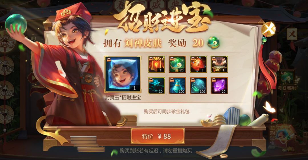 这个价值88元的礼包,其中最引人注目的,当然就是刘禅*招财进宝。