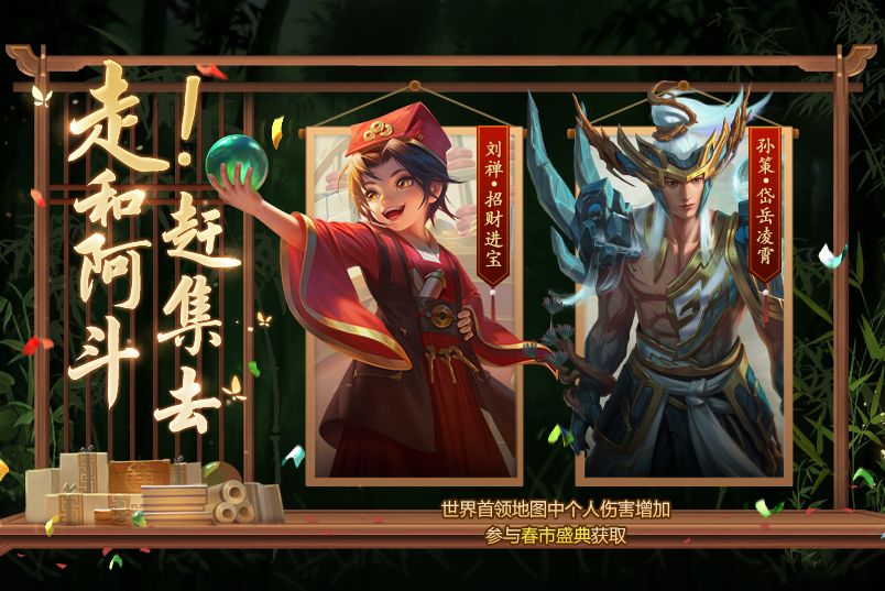 那么这次春市盛典中,其中最值得期待的就是本次全新上线的换装刘禅*招财进宝和孙策*岱岳凌霄。