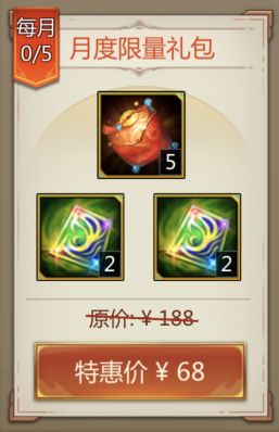 并且充值68元同样可以完成版本首充任务,获得月光宝盒十连抽。并且月度限量礼包限购5个,通过重复购买也能够达成前面几档的珍宝,同样可以获得丰厚的珍宝奖励。