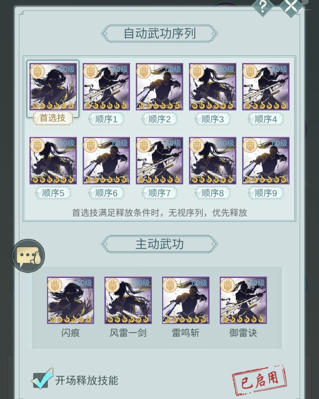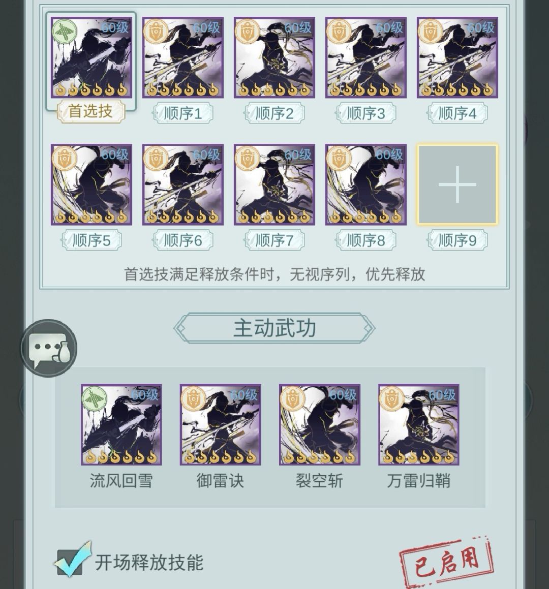 这个技能要尽可能的最大频率释放,配合消耗使用奔雷buff,还可以提高输出、回复剑意,缩短冷却。