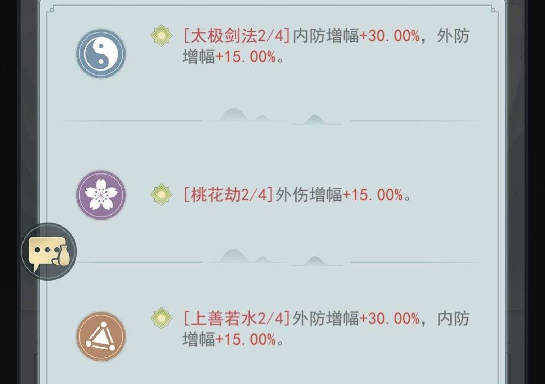 太极上善保证生存,又有全程桃花劫的15%增伤加持,保证肉度也保证输出。同时还可以选择自己词条最好的剑式上阵。