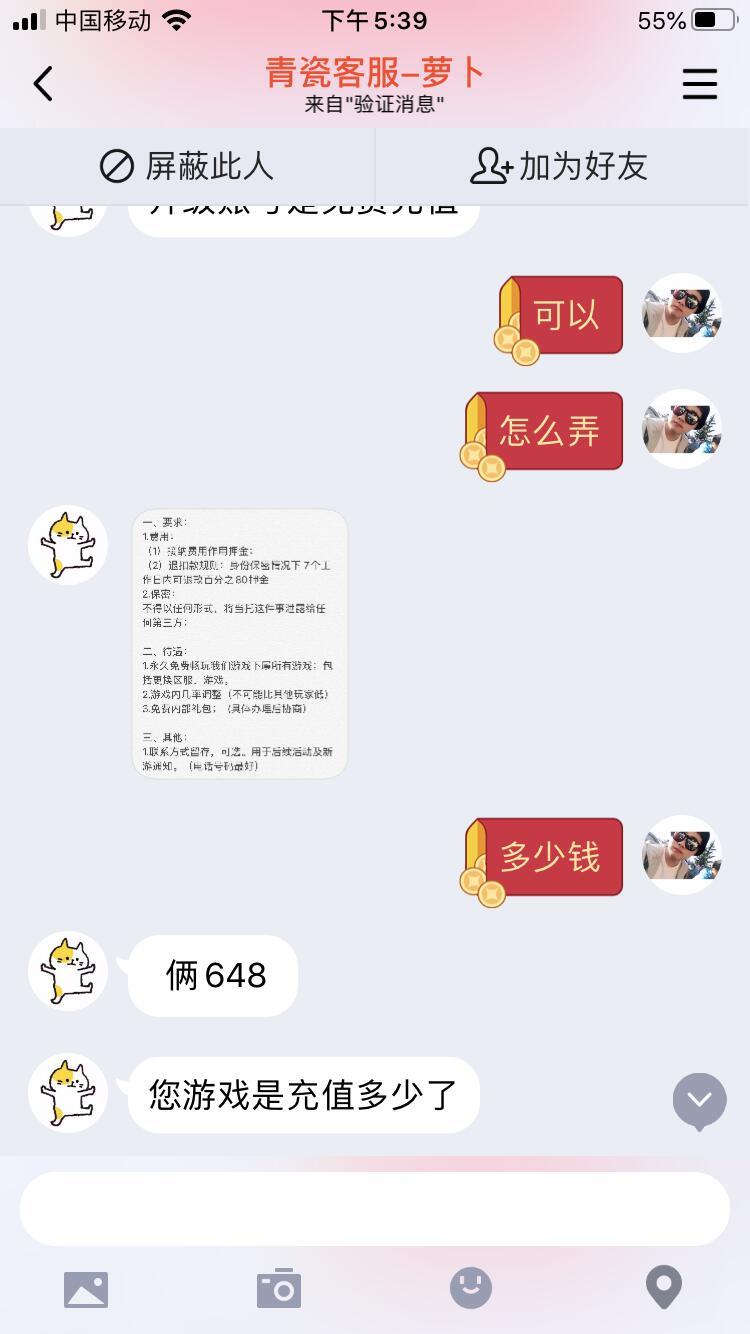 这个骗子假冒成客服-萝卜骗钱,幸好机智的玩家没有相信,并第一时间跟我们反馈!![[嗒啦啦2_优秀]](https://img.tapimg.com/market/images/bbb6da13ee1c31ee1405e261f12f366e.gif)