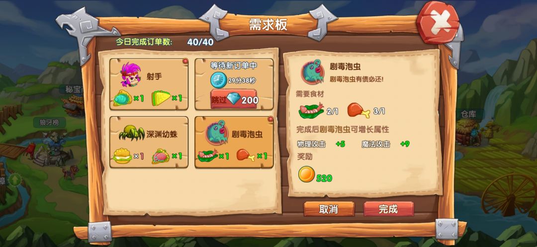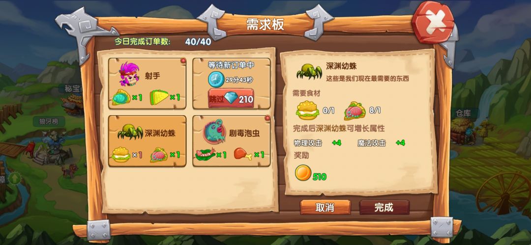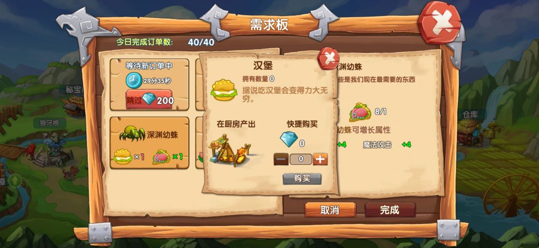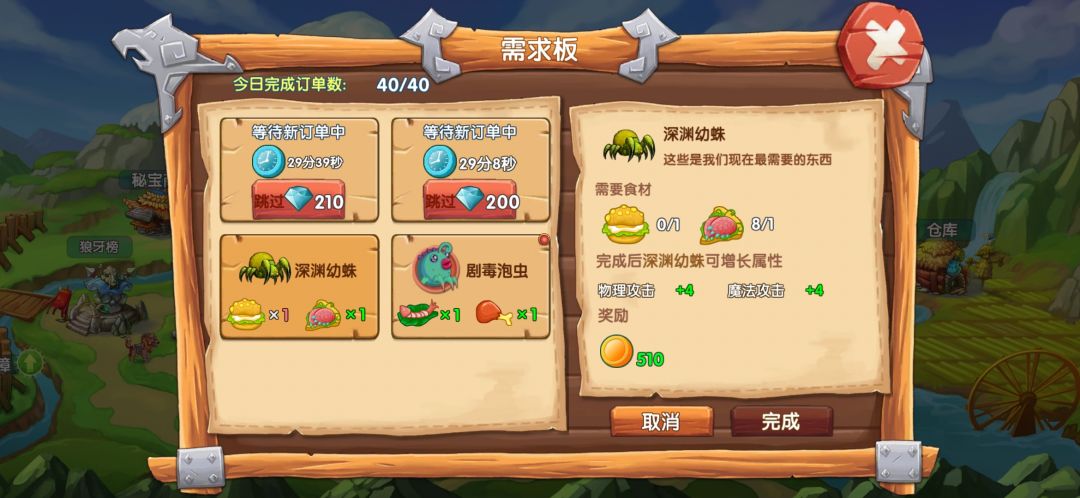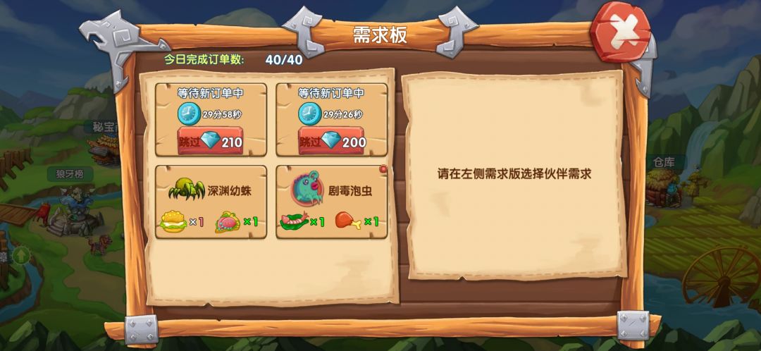 在确定取消订单后会进入一个30分钟的倒计时,倒计时时间到了会产生新的订单,由于大家不怎么缺钻石,我们可以直接选择花钻石跳过。这样就跟刷商店一样,刷优质的订单了。