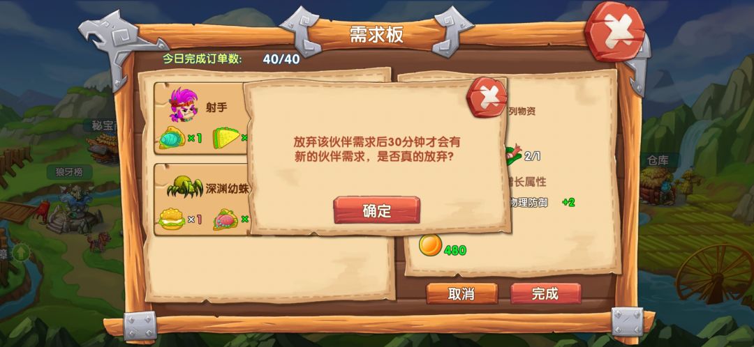 由于我还是V10,目前只能做40个订单,但都是一样的,大家看一看这个上古炎龙的订单奖励480金币,就知道这不是啥好订单,往上面一看果然,生命+6物理防御+2提升总和为8点基础属性。总和加8的传说订单就属于最差的订单了。所以我们要点取消,如例图2所示点击确定放弃,就变成例图3的样子了。