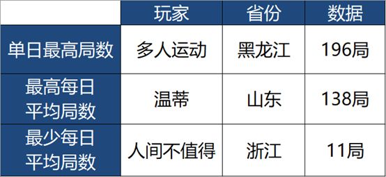 当然有天赋型选手,自然就有闻鸡起舞,废寝忘食的“努力型”玩家!其中最突出(恐怖)的是来自山东省的“温蒂”,本次周赛排名第17。在过去一周内,她的个人游戏局数来到了1105次!粗略算一下,如果每局打满三分钟,这可是接近55小时的游戏时长!如此努力的玩家,比赛奖金简直是手到擒来~
