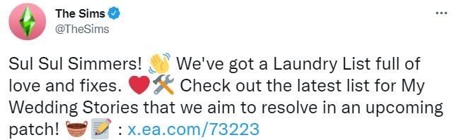 《模拟人生》官推分享了一份“修复清单”,列举了将对“婚旅奇缘”DLC进行的各项修复。清单几乎囊括了“婚旅奇缘”里的所有婚礼事件。该补丁还将在协调婚礼活动方面进行广泛的改进。目前,在DLC中,许多NPC模拟市民会忽略玩家参与活动的命令,比如拒绝参加婚礼。总的来说,该清单列出了“婚旅奇缘”的13个大修复项,然而,补丁的发布日期官方并没有宣布。