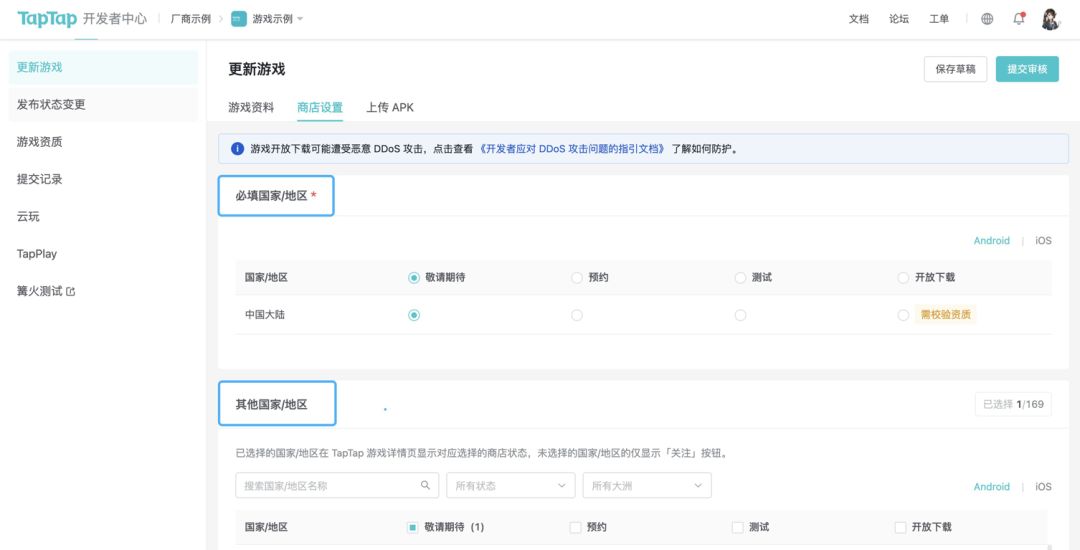 「其余国家/地区」:发布状态非必填,复选后可取消勾选(取消勾选后,游戏页面将不会上架当前国家/地区)