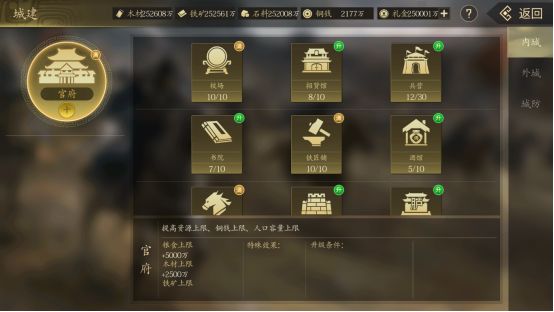 官府:官府是其他城建建筑解锁的核心和城池资源存量的上限,请优先提升官府的等级。