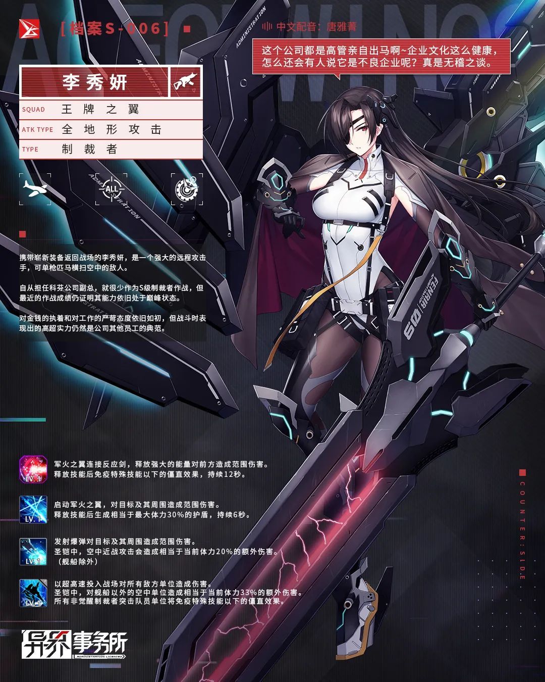 老板,周五晚上好,公司里的她们总是喜欢把周五的晚上也划归到周末,因为等待她们的是可以放松身心的休息日。不过我想前提是……侵蚀体也放假,不会来叨扰。今日这份情报是关于「王牌之翼」李秀妍的作战情报分析攻略,应该非常派得上用场,您随时可以浏览。对了,祝您周末愉快,老板~