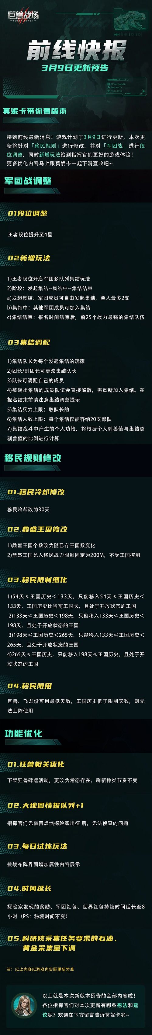 3月9日将进行版本更新,本次将针对【移民规则】、【军团战】进行调整,具体调整优化内容如下:
