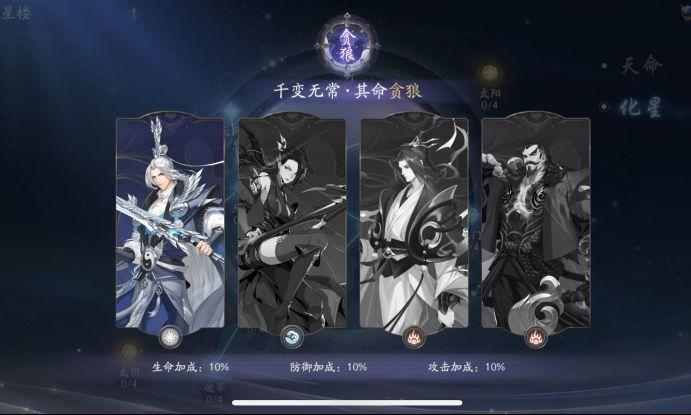 天命将侠客进行星辰分组,每组四个侠客,一个阴阳带三个四系卡牌为一个星辰分组。