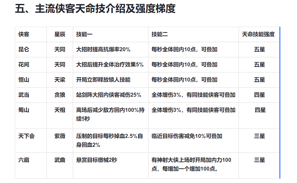 五、主流侠客天命技介绍及强度梯度
