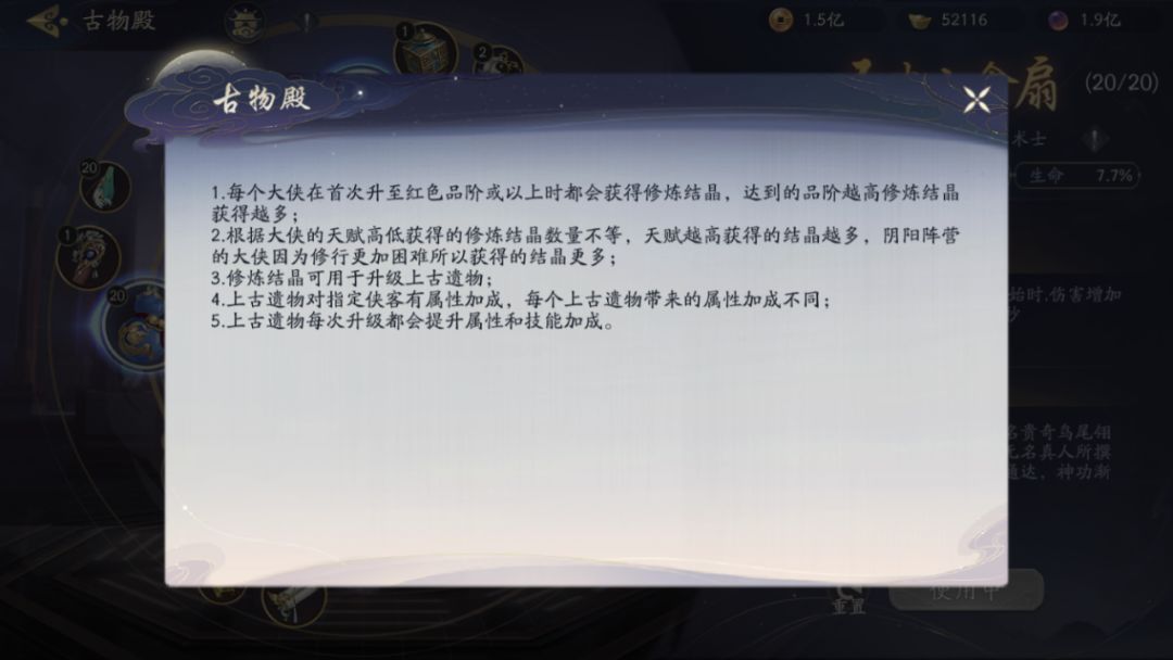 小技巧:升阶的大侠卡影响着珍宝阁古物殿的法宝等级,前期升阶材料紧缺的情况下你可以升到白四以后退还,哪怕你用同系其他大侠卡去填也可以,反正可以重置退还,这样你可以在升阶材料紧缺的前期提前获取多的法宝等级,学会极限拉扯很重要。