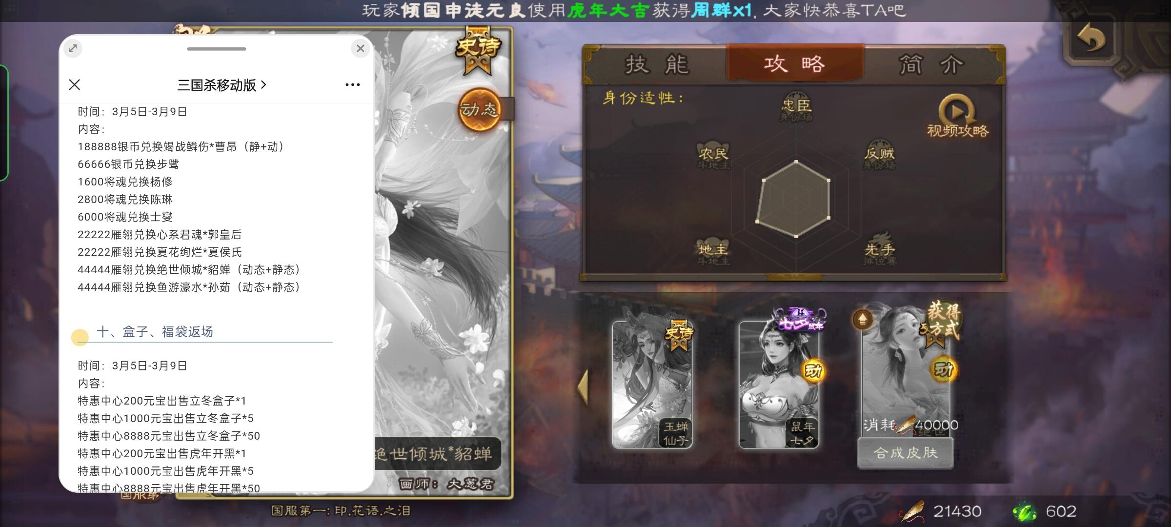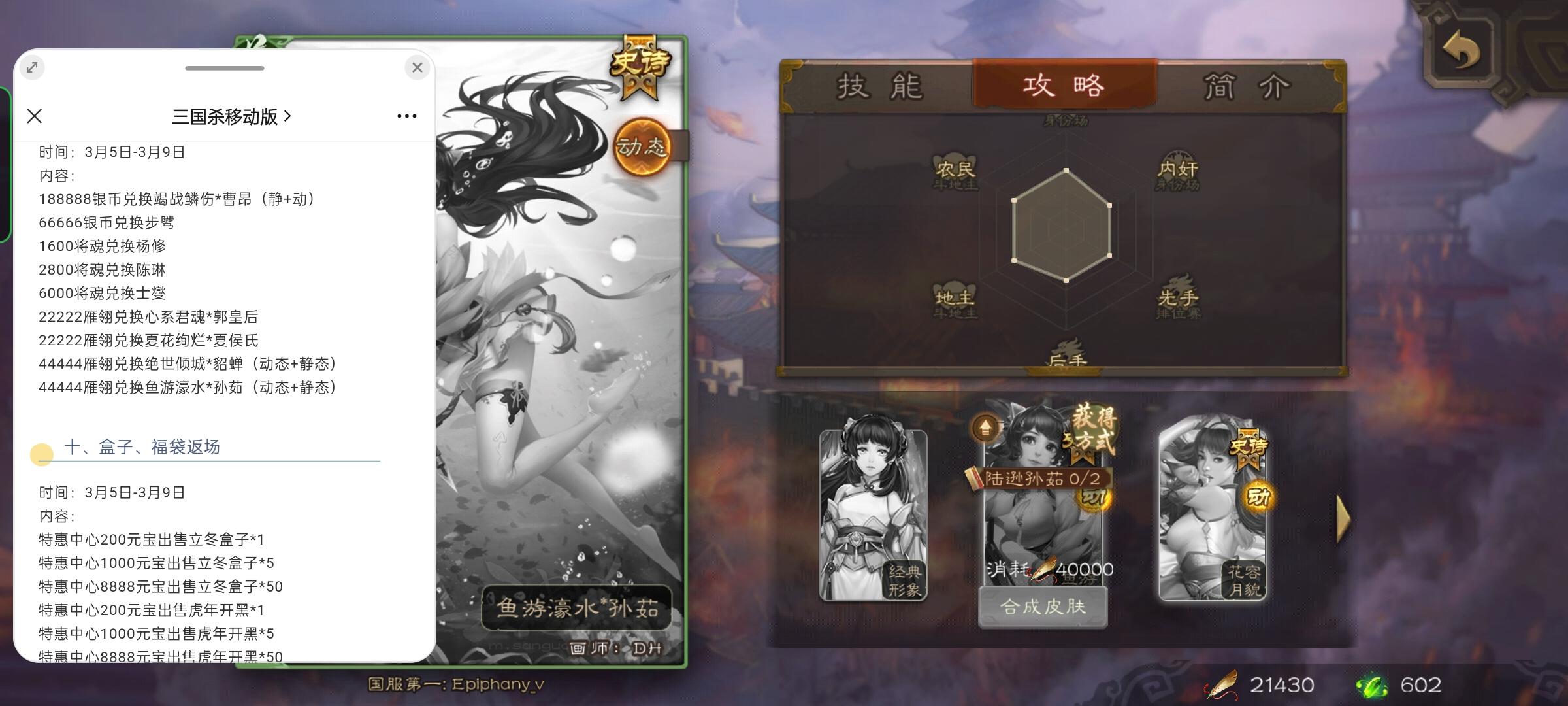 ✓卡你看看新出的女神节吃相难看,你对比一下活动用羽毛换的貂蝉的绝世倾城动态+静态皮肤和孙茹的鱼游濠水动态+静态皮肤不减羽毛反而增加我上图懂得都懂。