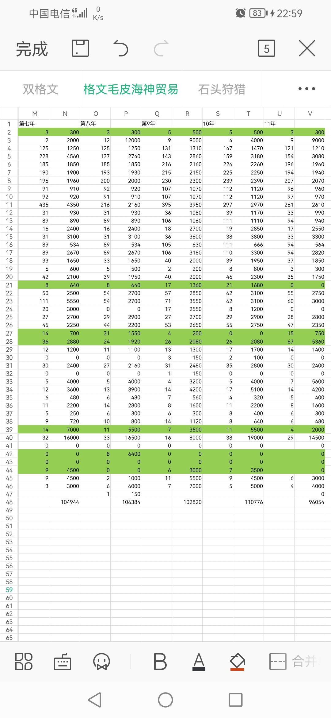 原因:双格文中的木头类没有橙色物资,而蓝色白色物资有很强的稳定性。多不会太多,少不会太少(别看图里收益比贸易狩猎高,要知道很大一部分是有庄园的功劳,我扣去贸易的庄园木头类收益得出其实每年平均就一万多收益,而一万多只要贸易爆出几个橙色就能补上大半)