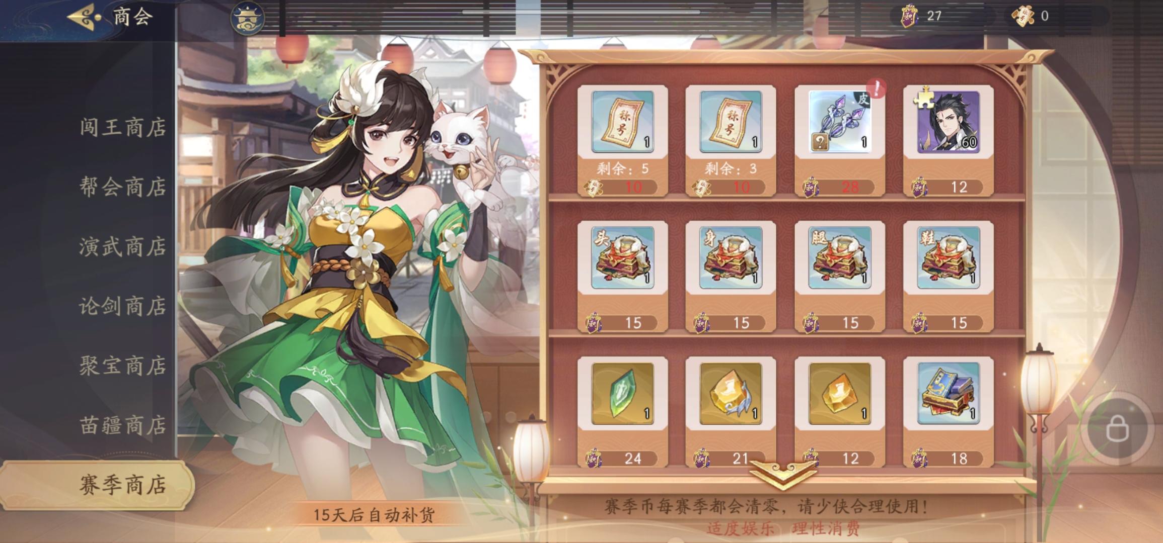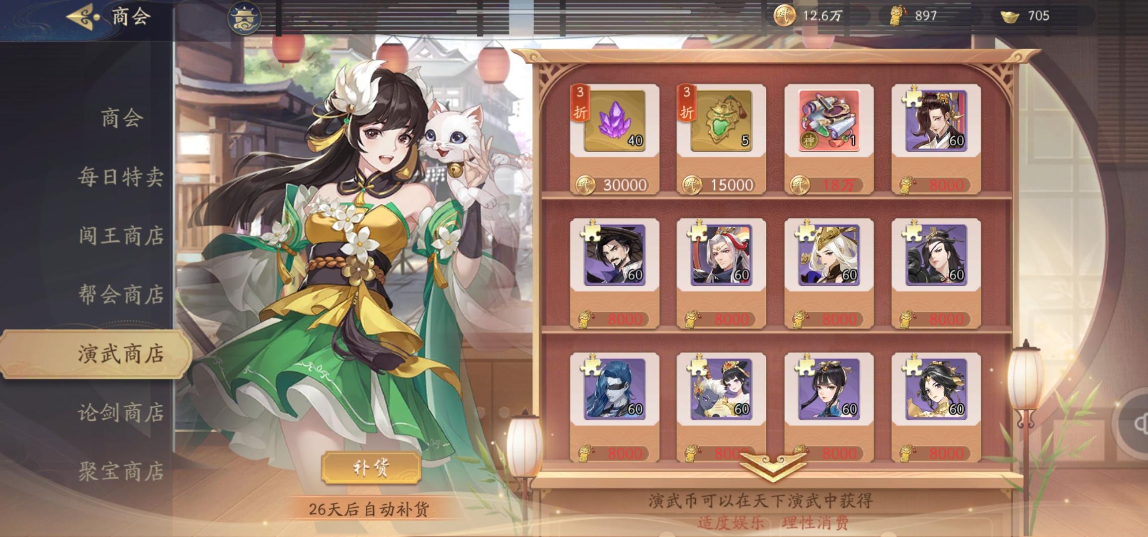 演武商店第二赛季第15天开启,可用演武币购买三系核心辅助花间派,恒山派,神水宫以及天工令,陨星矿不建议购买,还有于第四赛季也会在第三赛季持续三周后开启出的神书红色秘籍可用18万演武币购买(这里建议都是攒着购买)。还有参与巅峰论剑赛获得的巅峰论剑币可以换取阴阳侠客,建议换取自身阵容契合的阴阳侠客 例如:武当派,天下会,昆仑派等。