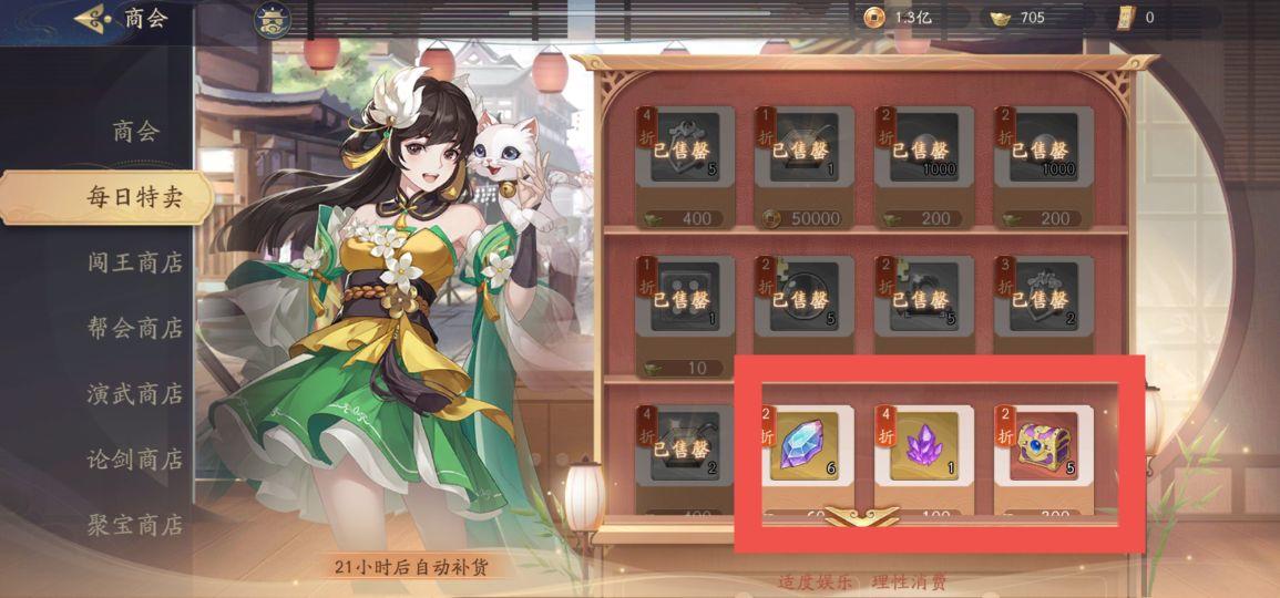 前面两排都买光,第三排金丝楠看自身元宝酌情购买,其他的洗练石,陨星矿,随机红色礼物箱,风华残缘(这里如果是皮肤党且觉得值可以买但是个人建议不买)都不买。