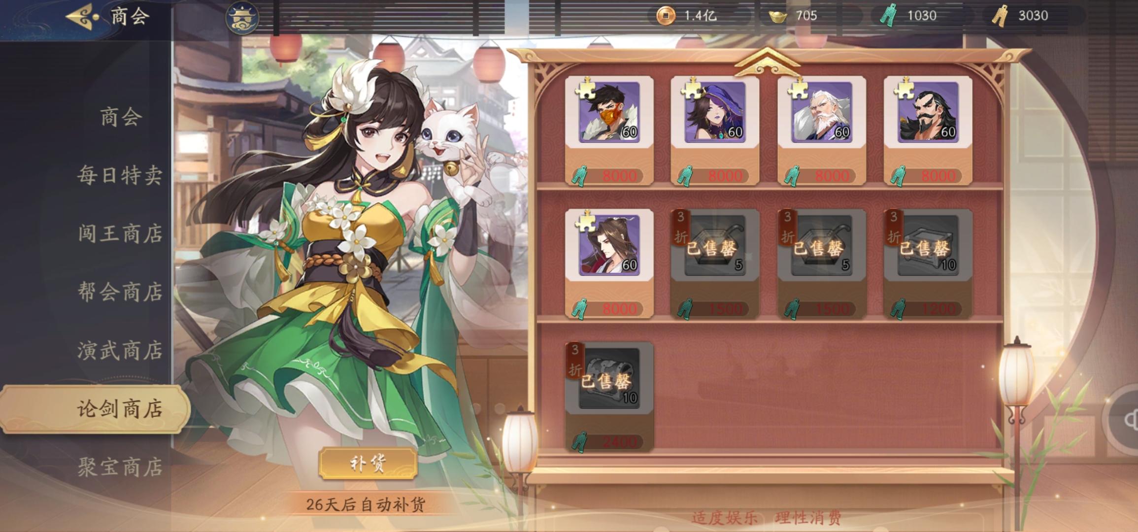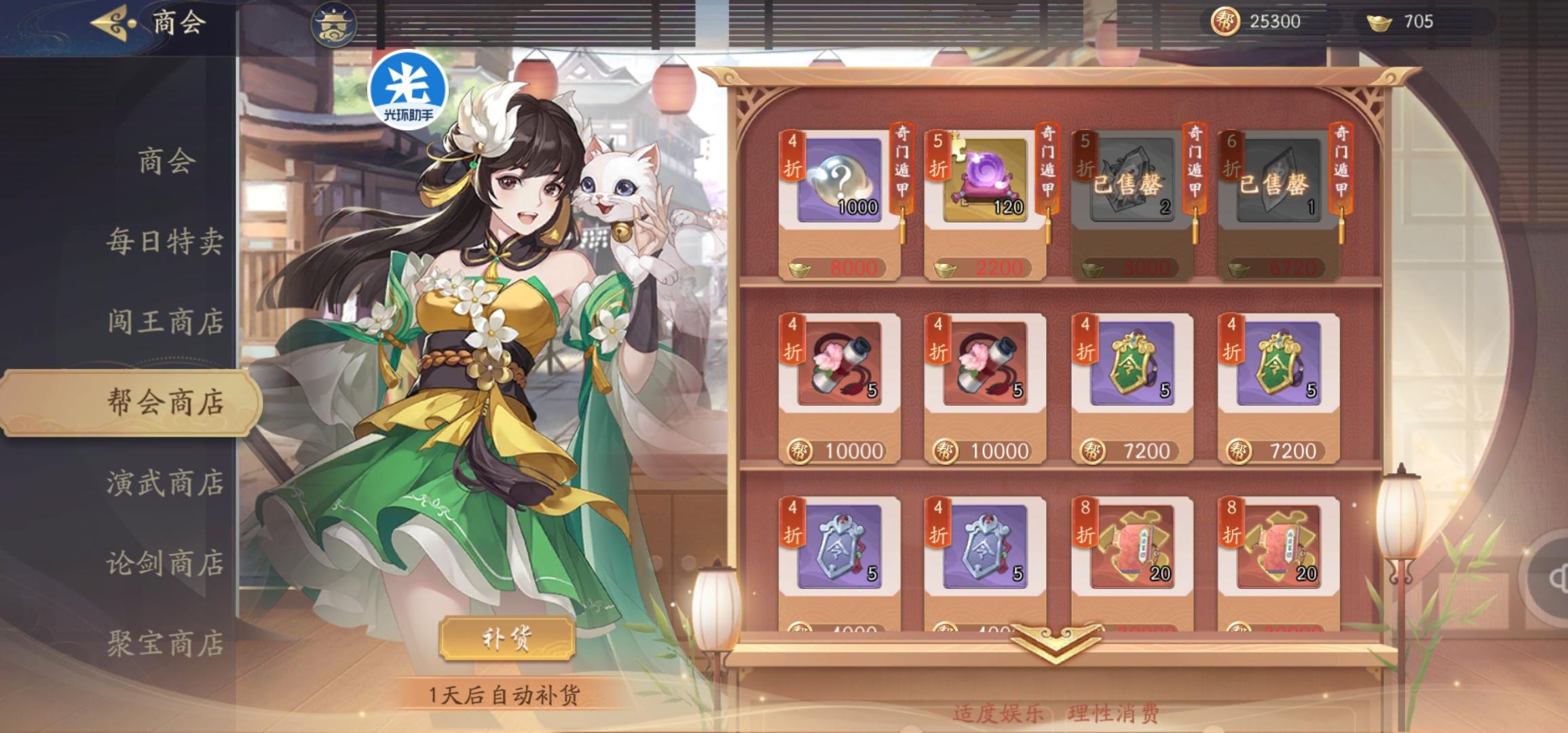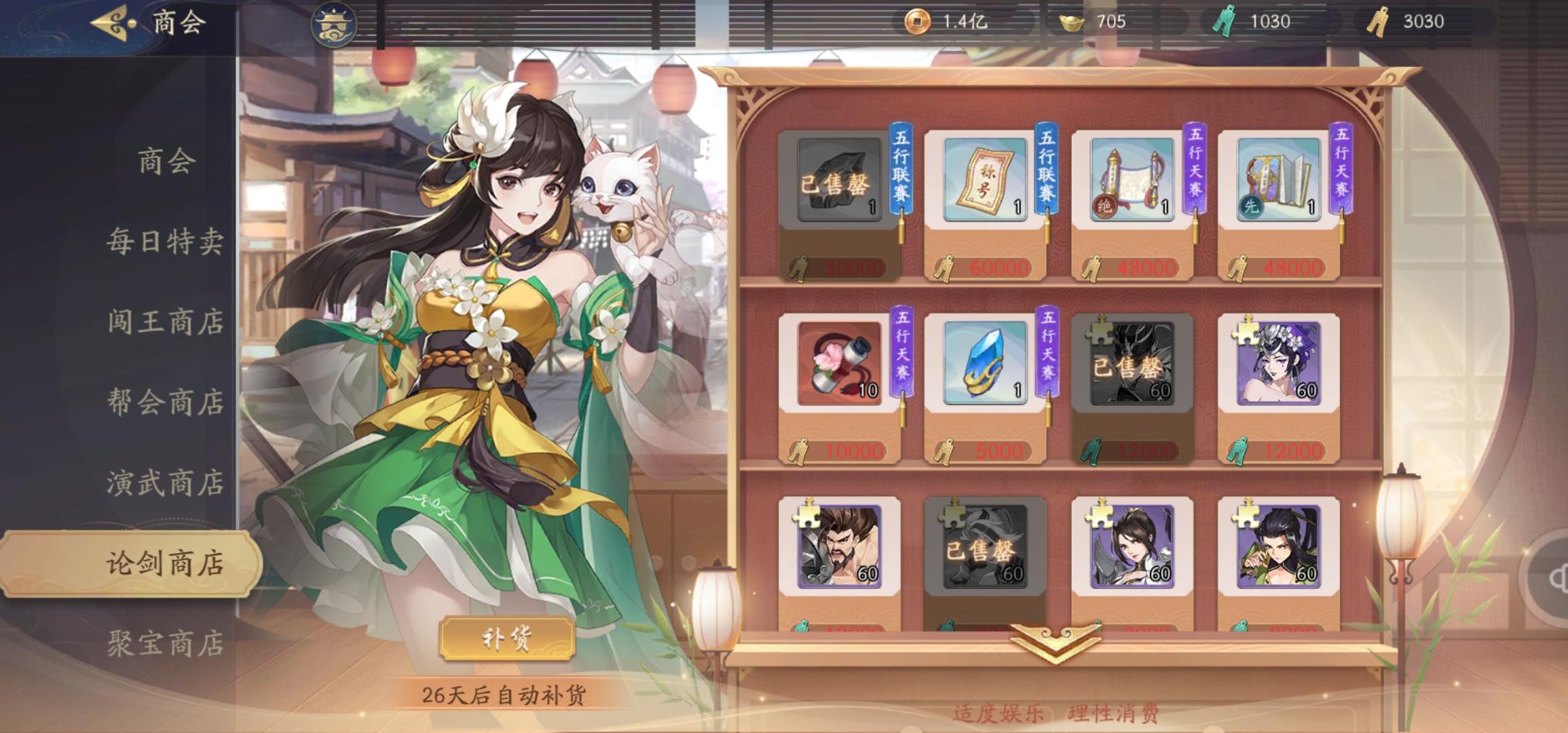 论剑商店这里用论剑币每次刷新建议换六扇门,嵩山派,金丝楠,以及第二赛季出的羁绊礼物。黄币币参加论剑赛逐步五行地赛,五行天赛,五行天赛获取。黄金刀币建议优先换神兵陨铁,前缘卷,白色秘籍,天运石等。(这里建议不换称号)