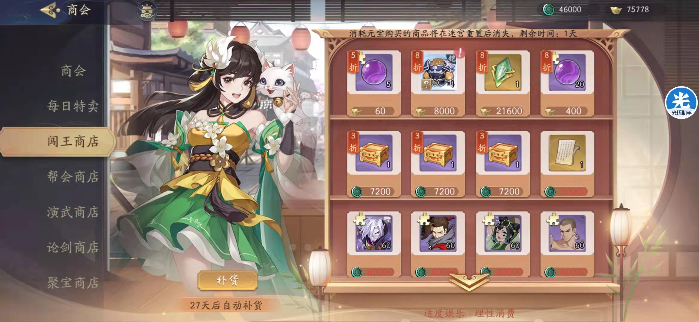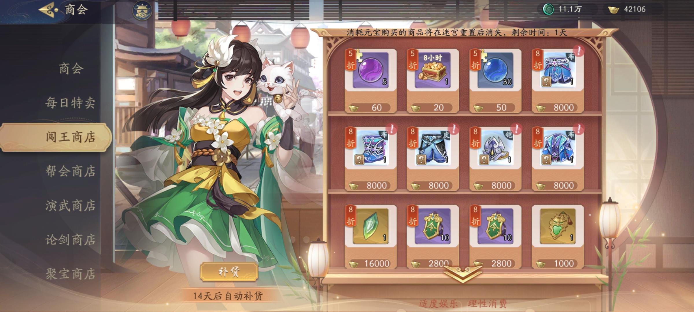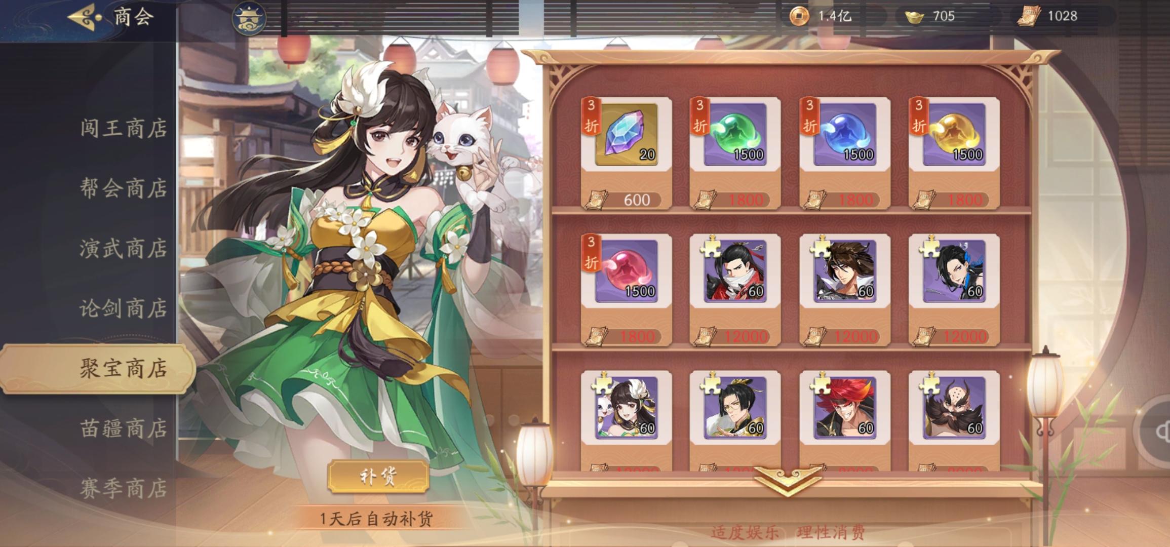 这里的核心侠客,紫色残缘,突破丹,以及第二赛季后续出的推演图必买,侠客自选箱都可购买,挑战闯王宝藏可能刷出白色阵营装备(这里酌情考虑购买在自身元宝充足情况下)还有玄阶,地阶武器石头,玄阶,地阶防具石头,招募令,天工令也会刷出。(这里也在结合自身元宝情况下购买)
