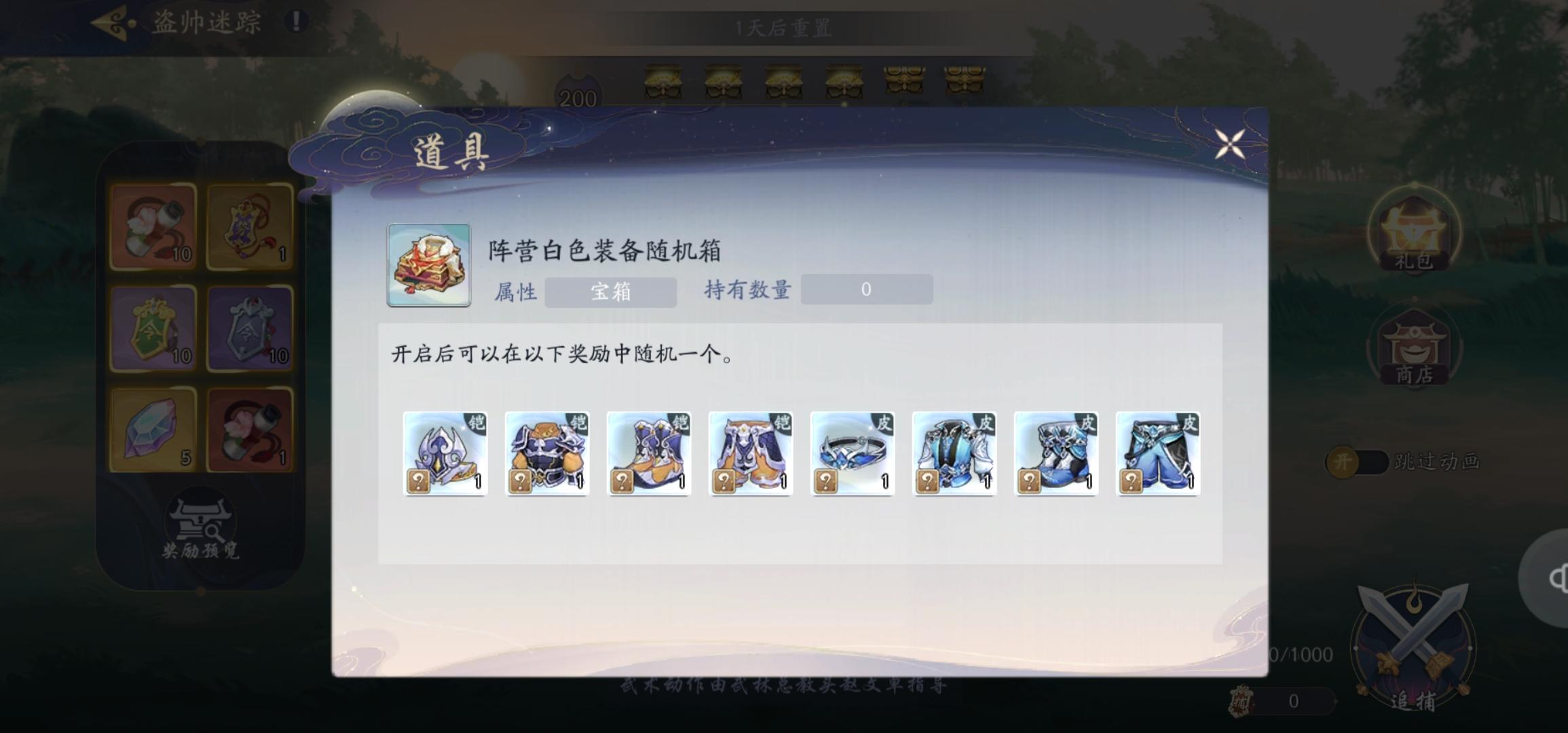 600元宝海捕令必买,这里第一天就开始攒200海捕令抽,后面两百箱子会出白色阵营随机装备可以获取。攒够600盗帅币换取阴阳卡或者推演图。(注:v11特权有2000盗帅自选随机阵营白色武器,这里肯定不介意换)