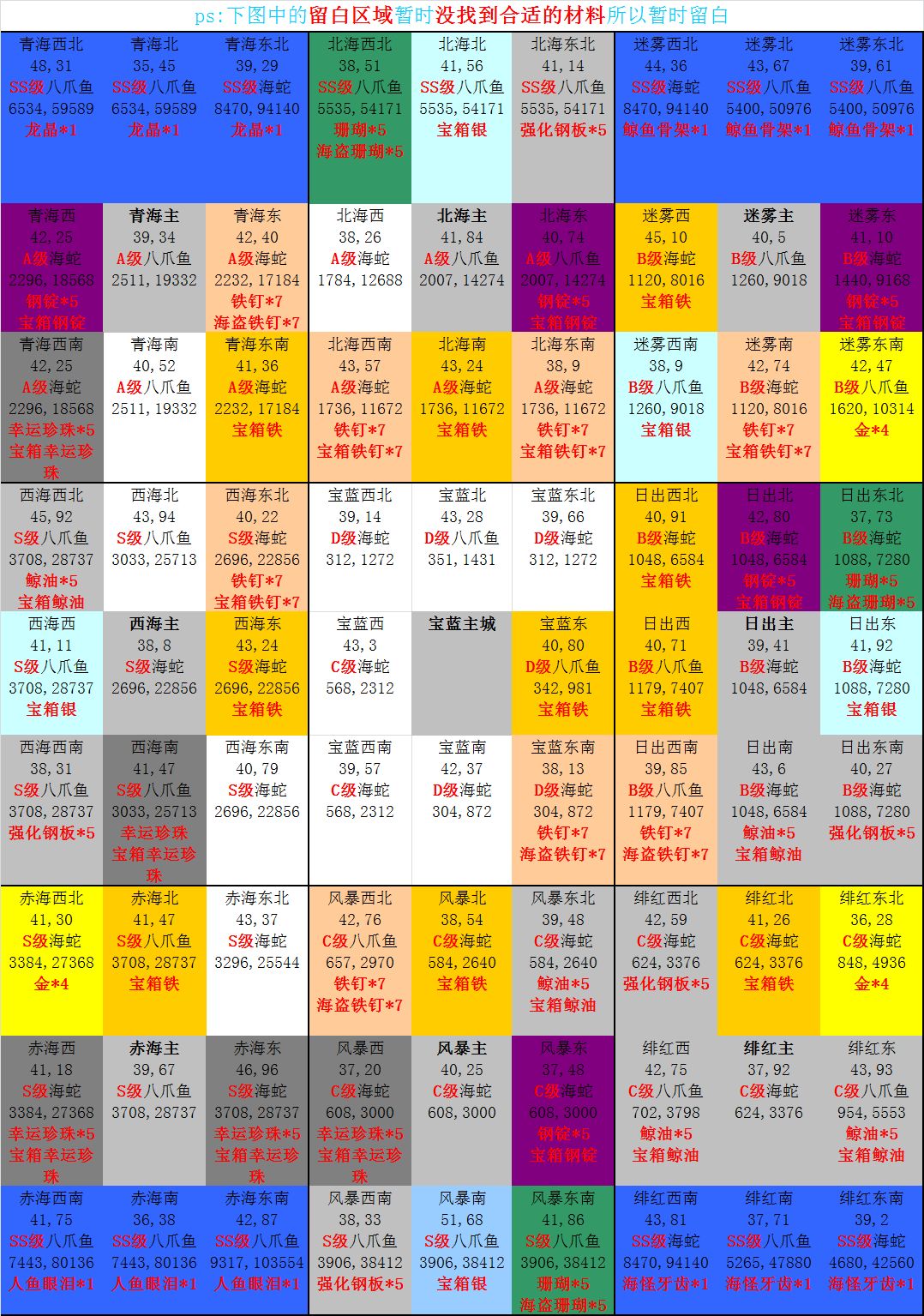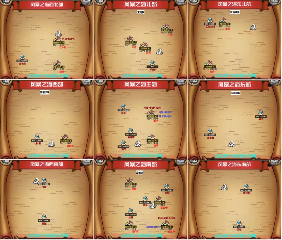 这是以前的图除了八爪鱼和海蛇互换之外基本都是一样的,缺啥可以照着打,建议六块钱买个搜刮,每六个月一次三倍战利品的机会用来打海怪,挺好打的,海盗强度和海怪强度成正比