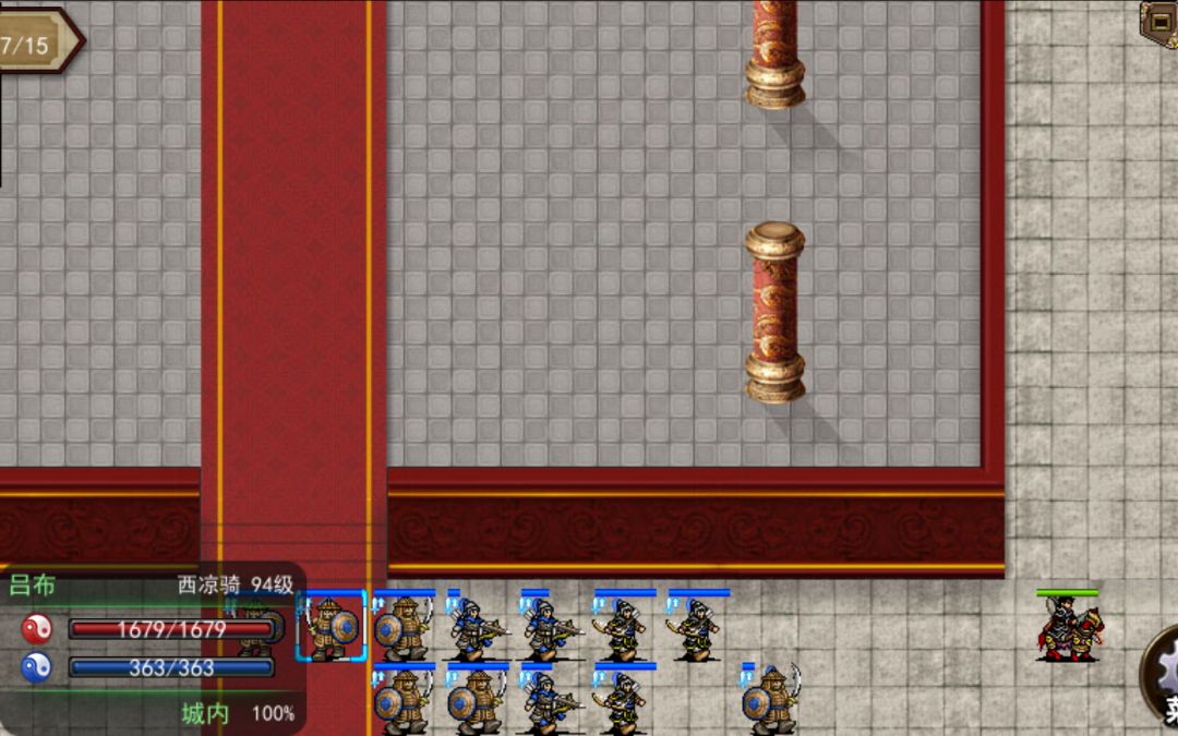 尽管吃了防御果,吕布还是被揍到一点血。这时就需要游击了,向后砍三刀,然后撤离,由此以往。