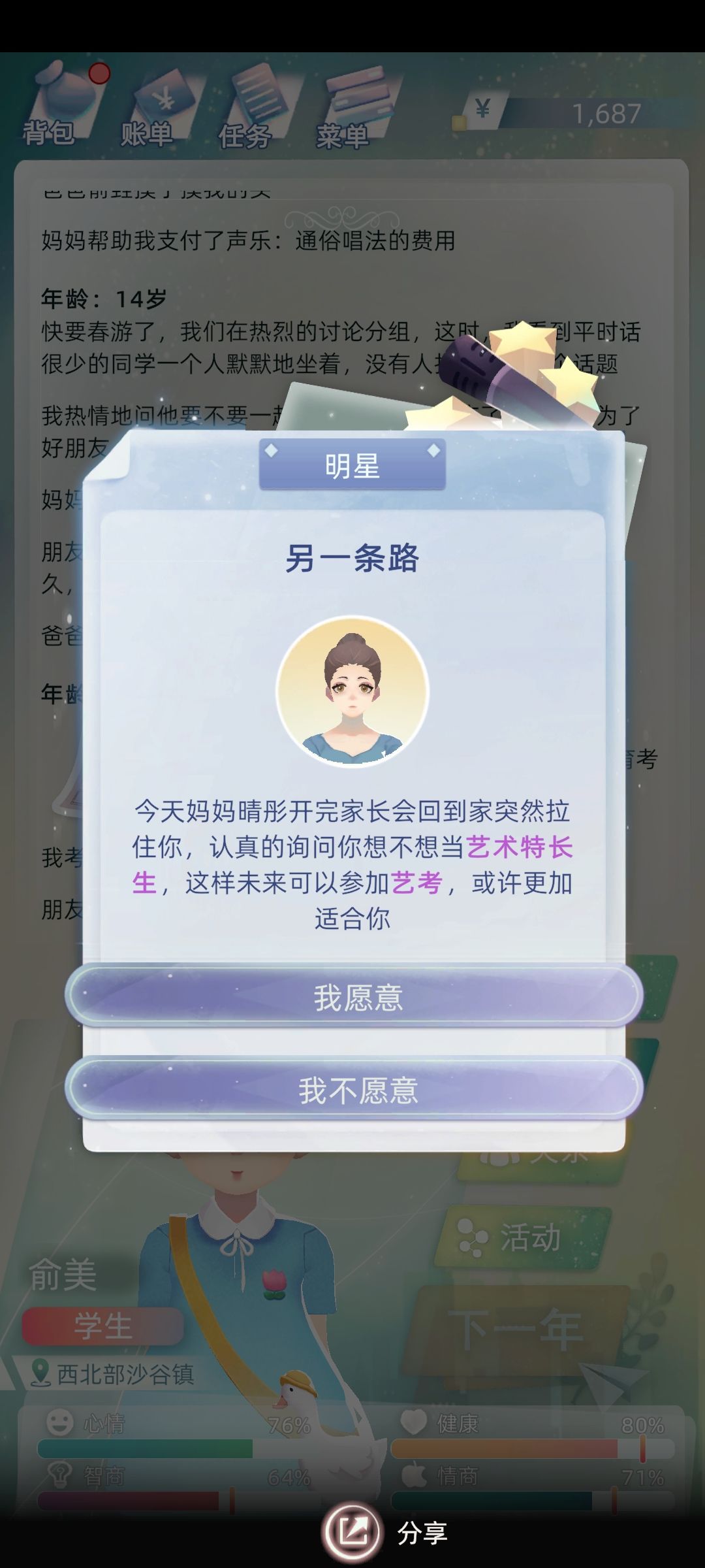 初三时触发艺考选项