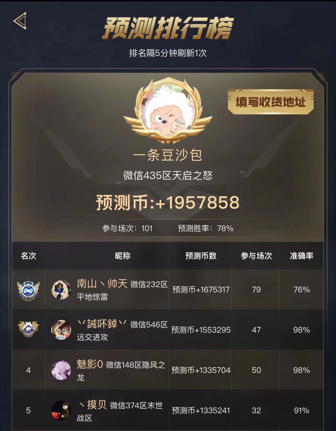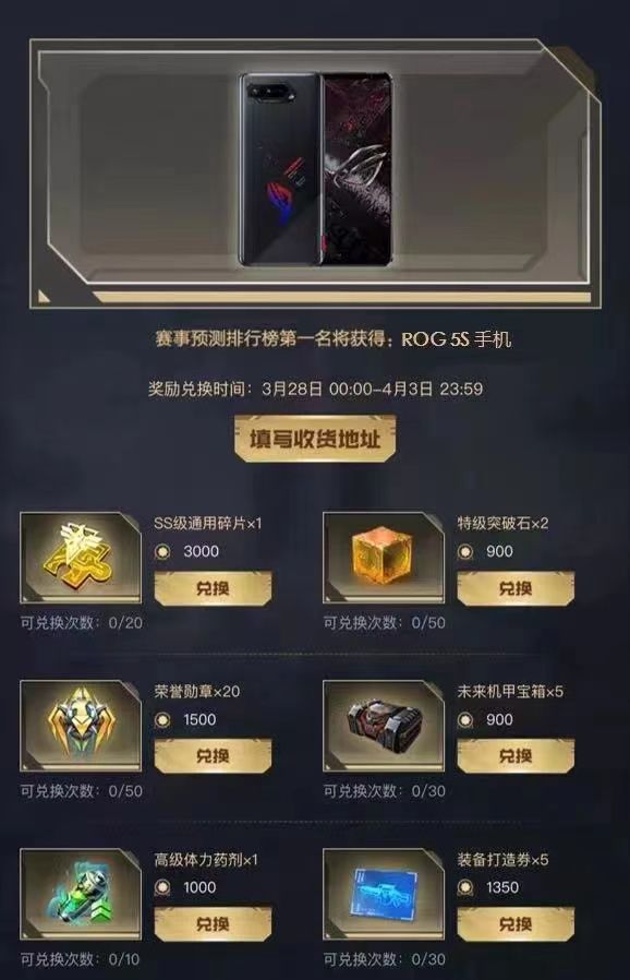 同时,活动设置预测排行榜,每隔5分钟刷新1次。最终获得预测排行榜第一的指挥官将获得ROG 5S手机一部!除此之外,指挥官还可消耗个人预测币,在奖励兑换商城中,兑换自己喜欢的游戏道具哦~