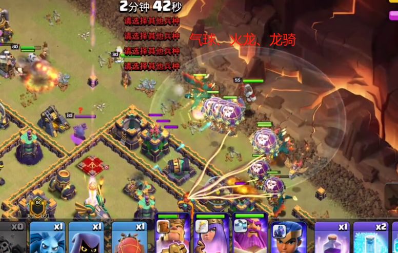 两侧清边差不多了后在中间下气球+火龙+龙骑,切记先下气球,再下火龙,下完火龙等一下再下龙骑