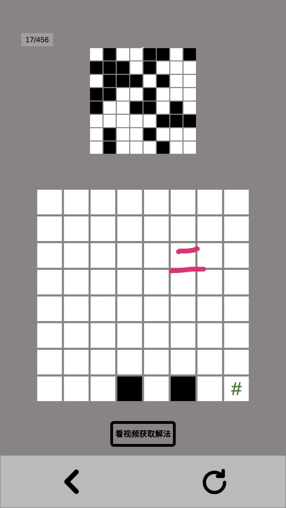 最后发现下数第一行的黑格出现在第3格和第4格(根据你开局在第一行点击的方格位置,开局点击其它行的方格也可以化归到点击第一行的某几个方格。然后依赖黑格分布图进行的固定化操作,固定化操作也就是你从第二行开始就只能点哪几个方格才能和黑格分布图趋于一致。导致最终最后一行出现的黑格位置是不固定的),和原图不匹配。