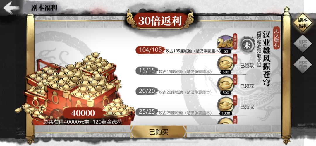 三是105个城,攻下所有(都触发江山一统事件了),剧本福利界面只给我算104城,领取不了60虎符。
