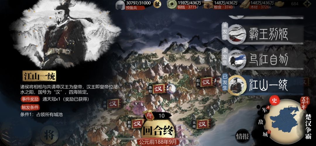 二是历史事件触发不了,领取奖励没到账。我188年9月打掉最后一个城,目前只触发了追韩信,暗度陈仓,江山一统三个事件。而且江山一统的通天冠领取了但找不到。