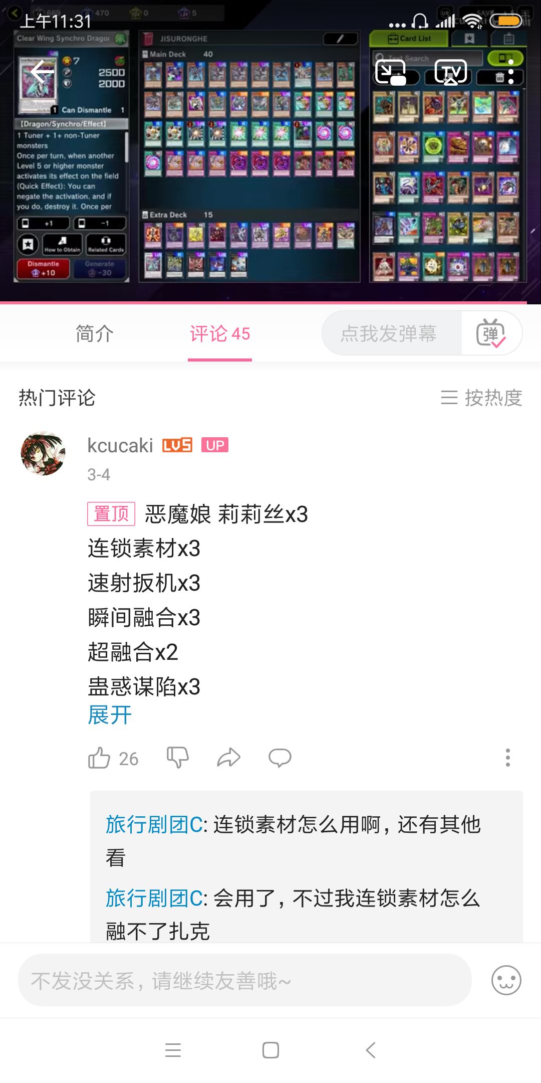 出自大佬kcucaki,自己稍微改了点,稳定性下降,但胡起来更舒服,打法是抢先手,然后找连锁素材(起手手卡要是没连锁素材和能找他的卡加任意一张融合,基本可以点了),注意有壶先将霸王眷龙外额外的同调龙融合龙超量龙各一张扔掉,后面用提耶拉捡回来,融合提耶拉,如果没壶就送墓上面的三龙,有壶随便送三张(扎克,木托邦,绝命三霸王眷别碰)之后没壶回拿码莉莉丝巴利,有壶拿三龙(符合条件的任意龙皆可),之后第二张融合有壶拉木托邦,木托邦拉扎克,没壶直接扎克(蛊惑谋陷有自肃,注意其他陷阱用完再放)然后又如果手牌够好,你这会下了或者还能找一张逆鳞,如果卡位等回合结束其他卡炸掉,没有木托邦可以直接开,拉四霸王眷龙,对手在手牌被你清空的情况下,面对五龙战场,基本就已经失去玩游戏王的资格了,造价方面,ur两超融合,三恶魔娘,提耶拉,拿码,扎克本克,如果要稳定点带磁石轴(主要腾卡位)合张磁皇神,卡组纯娱乐,强度不高,吃效遮吃泡影原地暴毙,后手胜率感人,造价略贵,除了那两狱火机的其他卡基本没有共通的上位卡组,看情况要不要玩,我这里不怎么推荐,但是还是挺有意思的,可以先去ygo试一下再看要不要在md里组吧