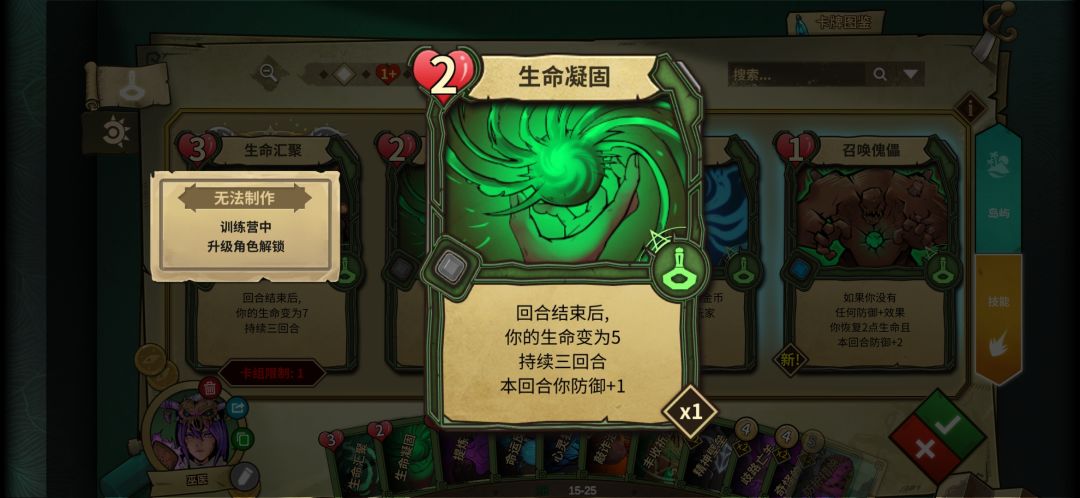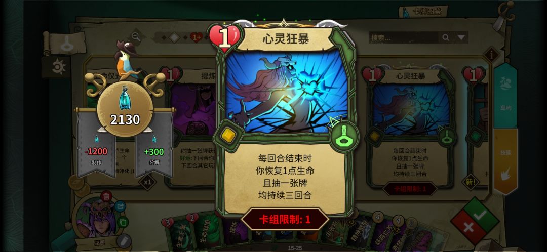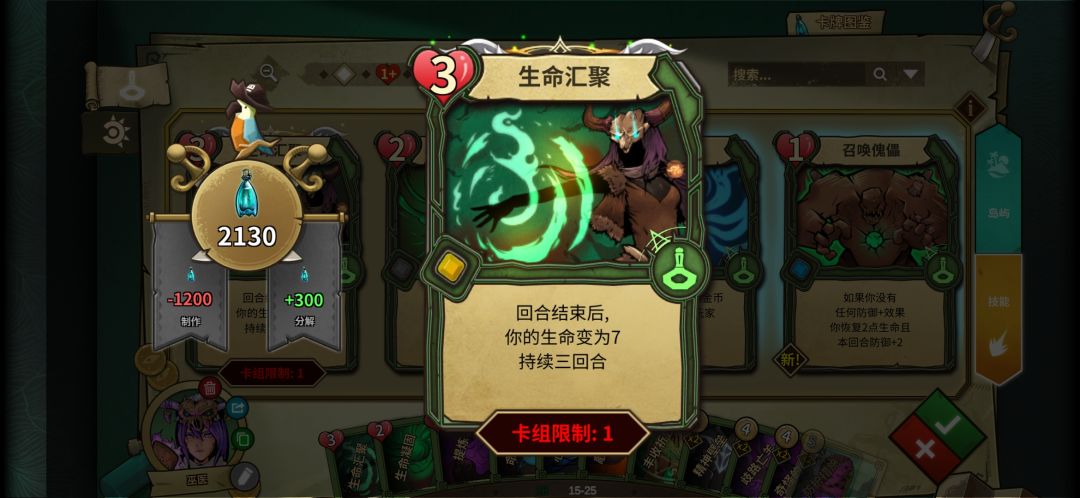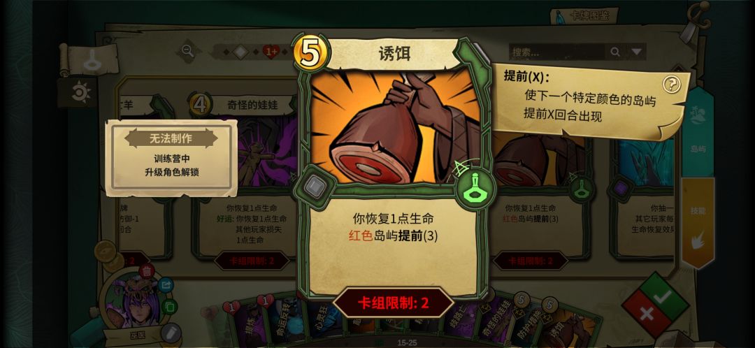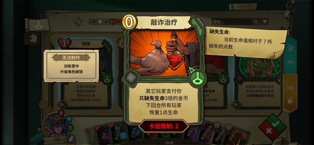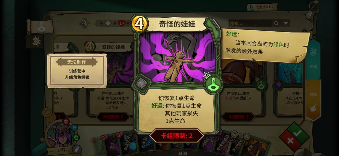 关于岛屿上的选项我们要尽量以保血为主,绿岛则以坑害别人为主,此卡组的过牌能力很弱,所以我们要尽量保证每次到休息站的时候都有至少四滴血,这样我们才能拿两张牌来过牌。