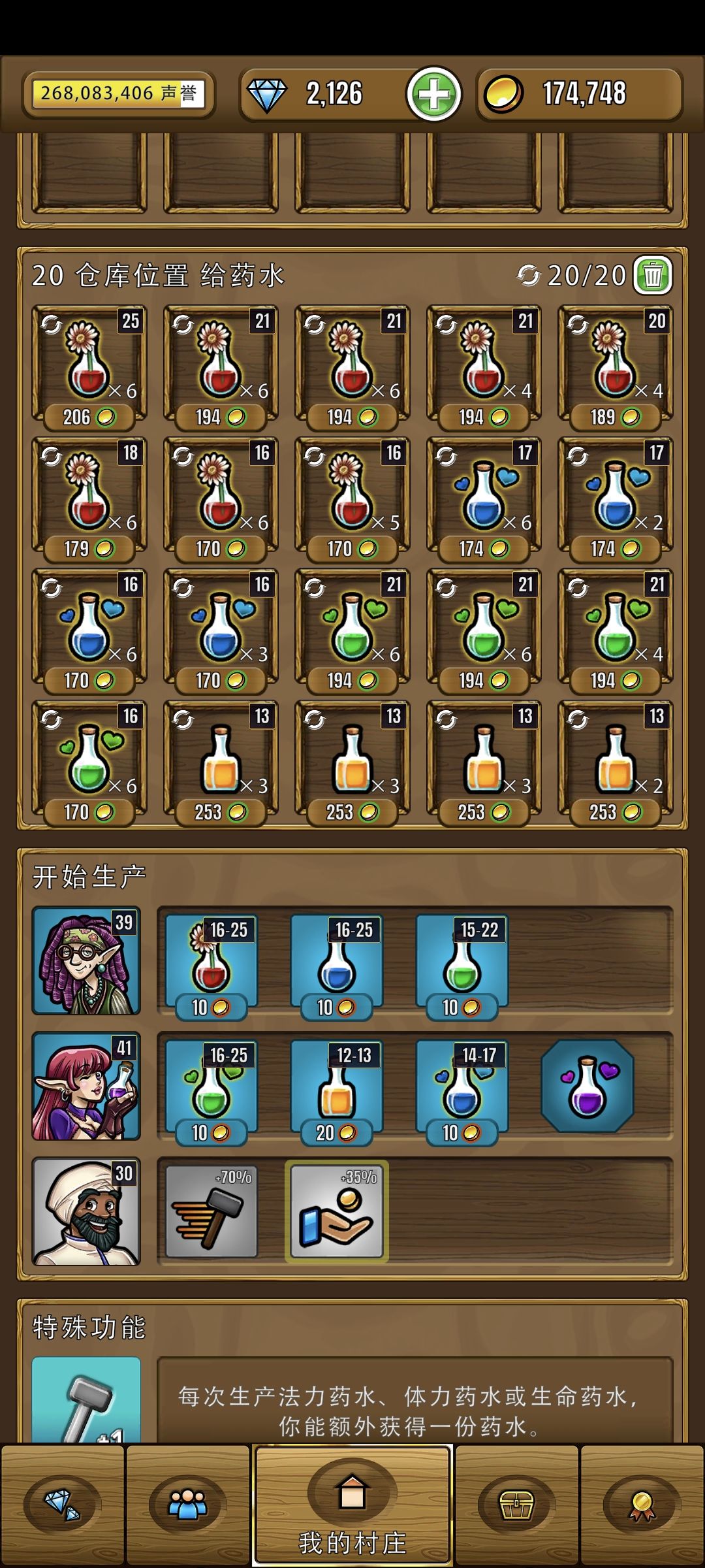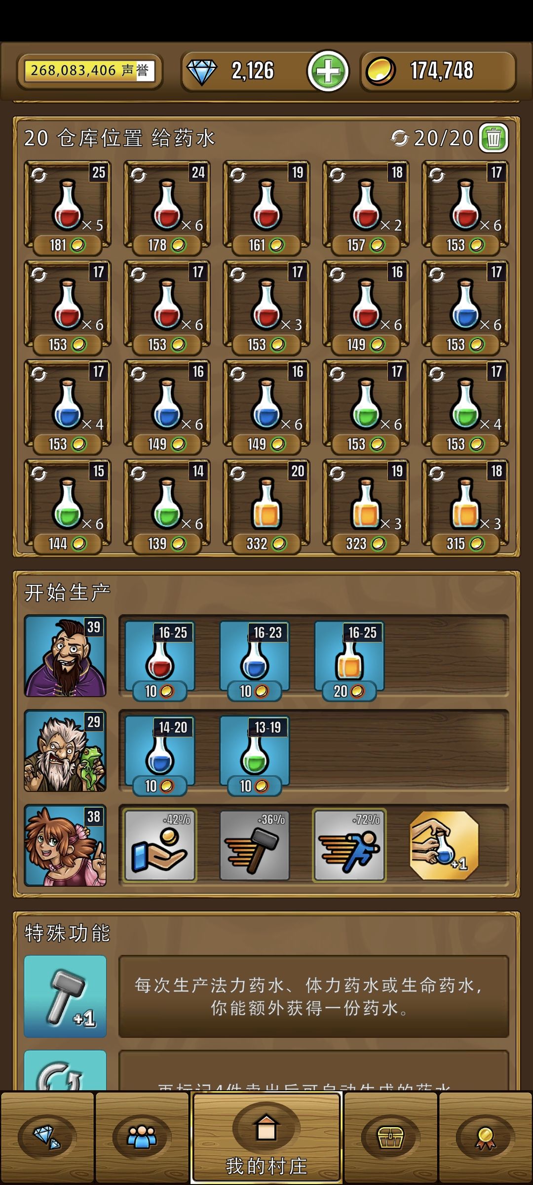 接下来是药水,为了加快效率,我们尽量把4个种类的药水都放在同一个房子里,防止英雄买了红药水,要跑出去买蓝药水的情况,同时我们要把效率和利润拉满,药水的制作时间非常短并且数量多,因此不需要减少制作时间