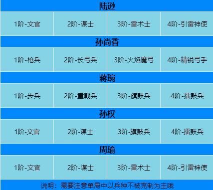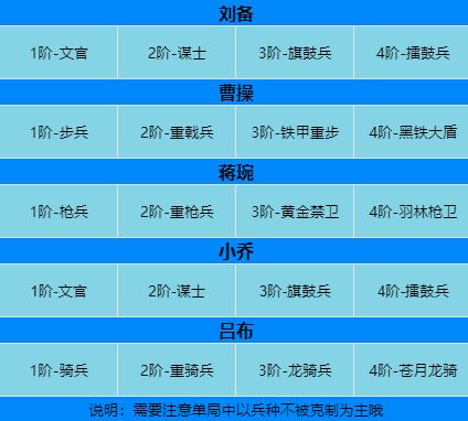 同时,以上推荐的阵型、兵种之类的都并不是绝对的,需要主公根据单局情况去调整。