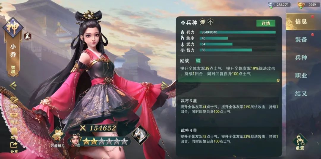 而曹操、刘备和小乔是这套阵容的次核心武将,基本无法代替,不过退而求次的话,也可用伊籍、曹植、朱治等回复士气的武将。