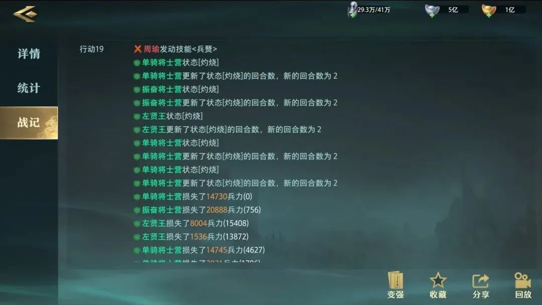 5号位周瑜,第二轮出手放技能的时候已经是buff积累完毕的状态了,一波爆炸策略输出之后,附加给敌人的灼烧buff还会不停的触发陆逊的点燃buff。
