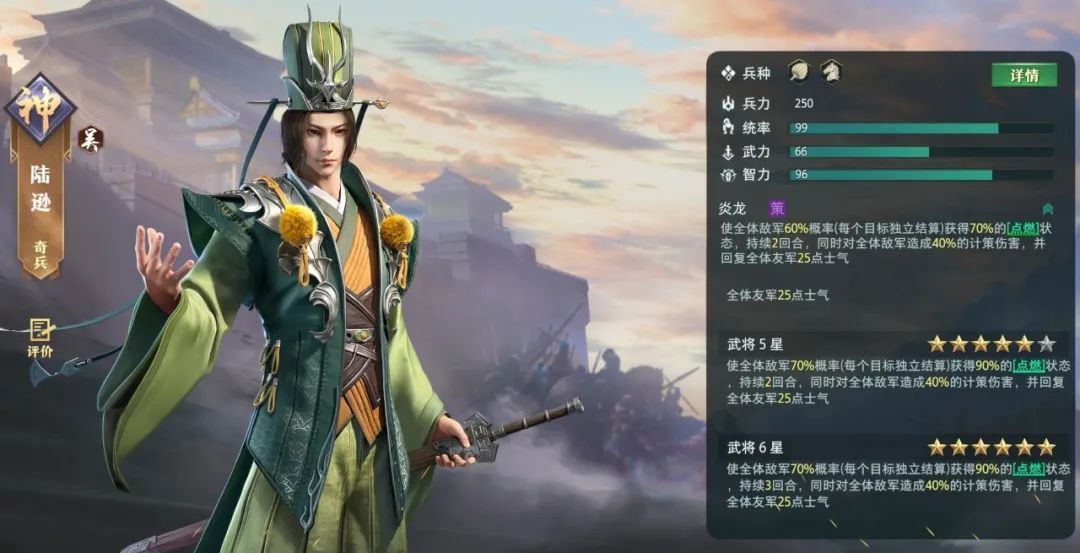 陆逊的主要作用是给敌方上【点燃】,所以针对对方的舞姬兵种,提升士气相对来讲是更重要的。孙尚香和陆逊同理。