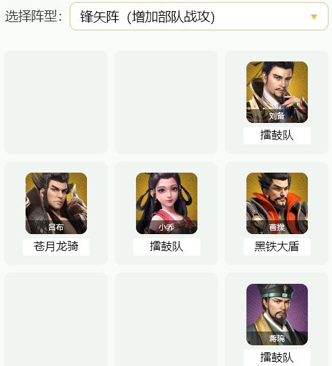 刘备放在1号位,第二回合一开始就会给吕布增加100点士气,2号位曹操增加55点士气,3号位蒋琬增加45点士气,4号位小乔增加35点士气以及15%的战法伤害。(均为0星技能效果)