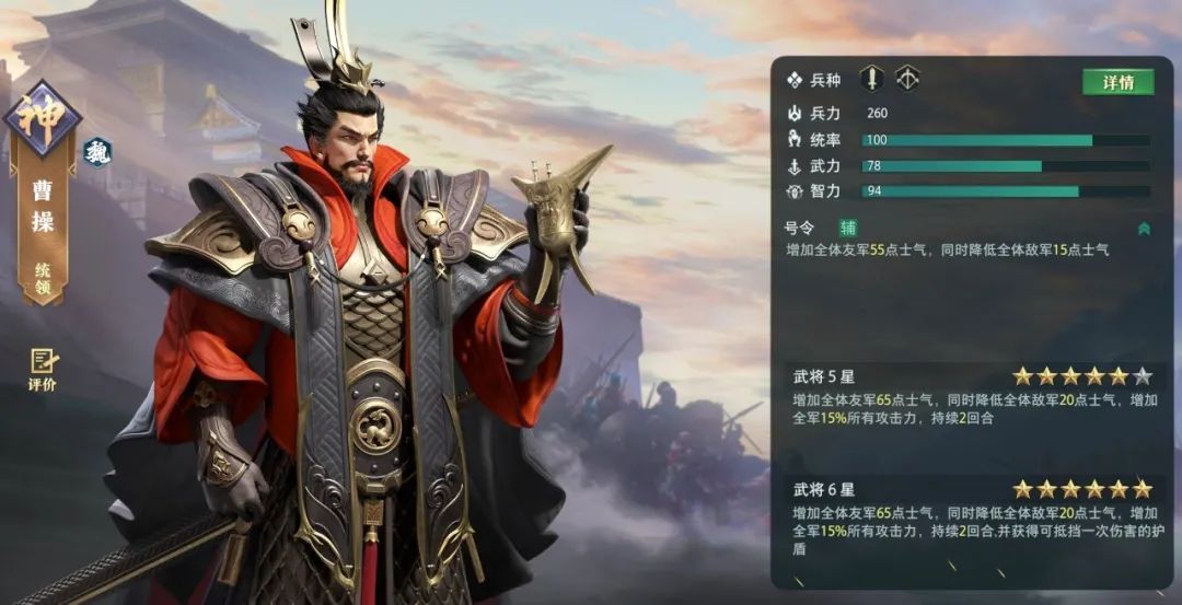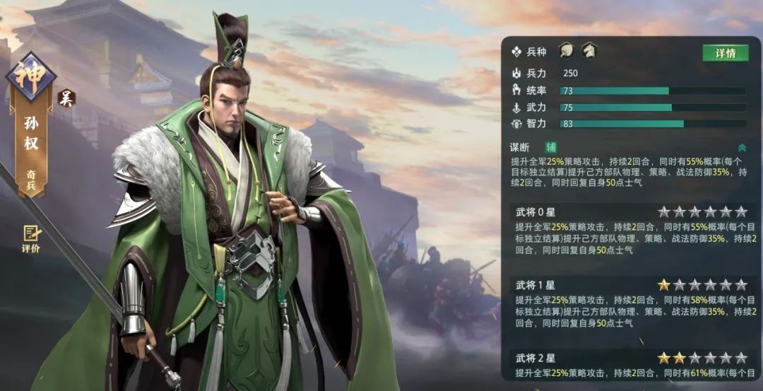 陆逊:优先选择士气马,通用战技优先顺序为命中、激励(增加己方士气)、威吓(减低对方士气)。
