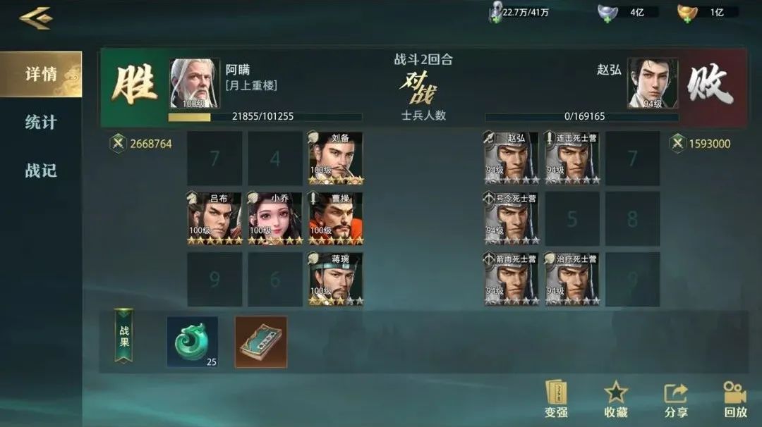 配合第1回合出手的25点士气,吕布第2回合释放技能时,伤害会十分恐怖!吕布放完技能后,友军基本上只剩曹操和刘备(专属马免死1次)活着,敌军只剩残兵难以造成威胁,然后吕布再放一个技能战斗基本就结束了。