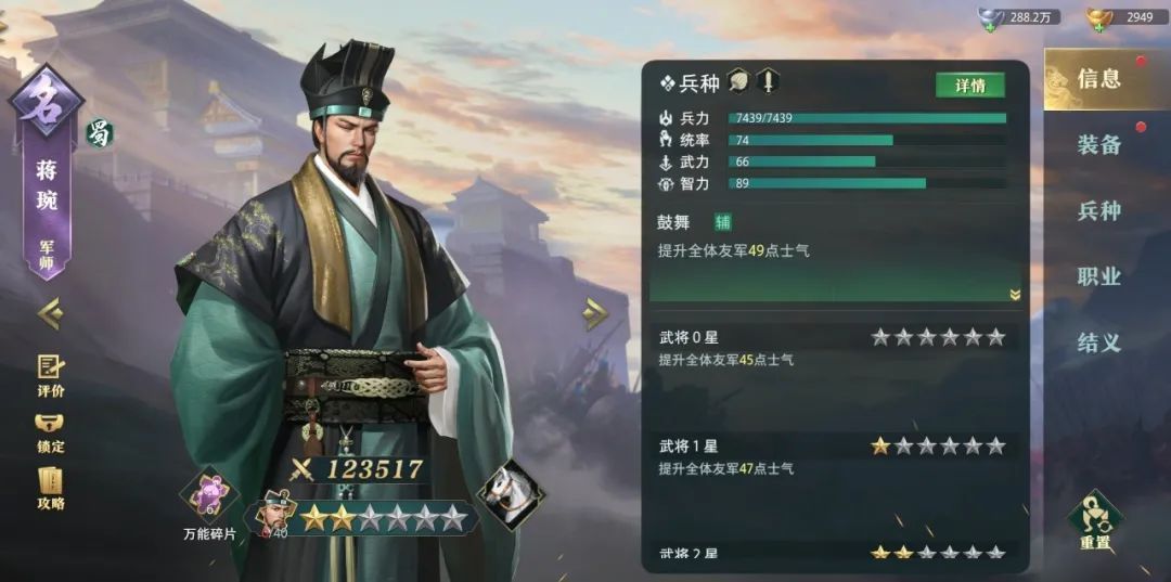 蒋琬:优先选择士气马,通用战技优先顺序为激励、威吓以及减伤类技能。